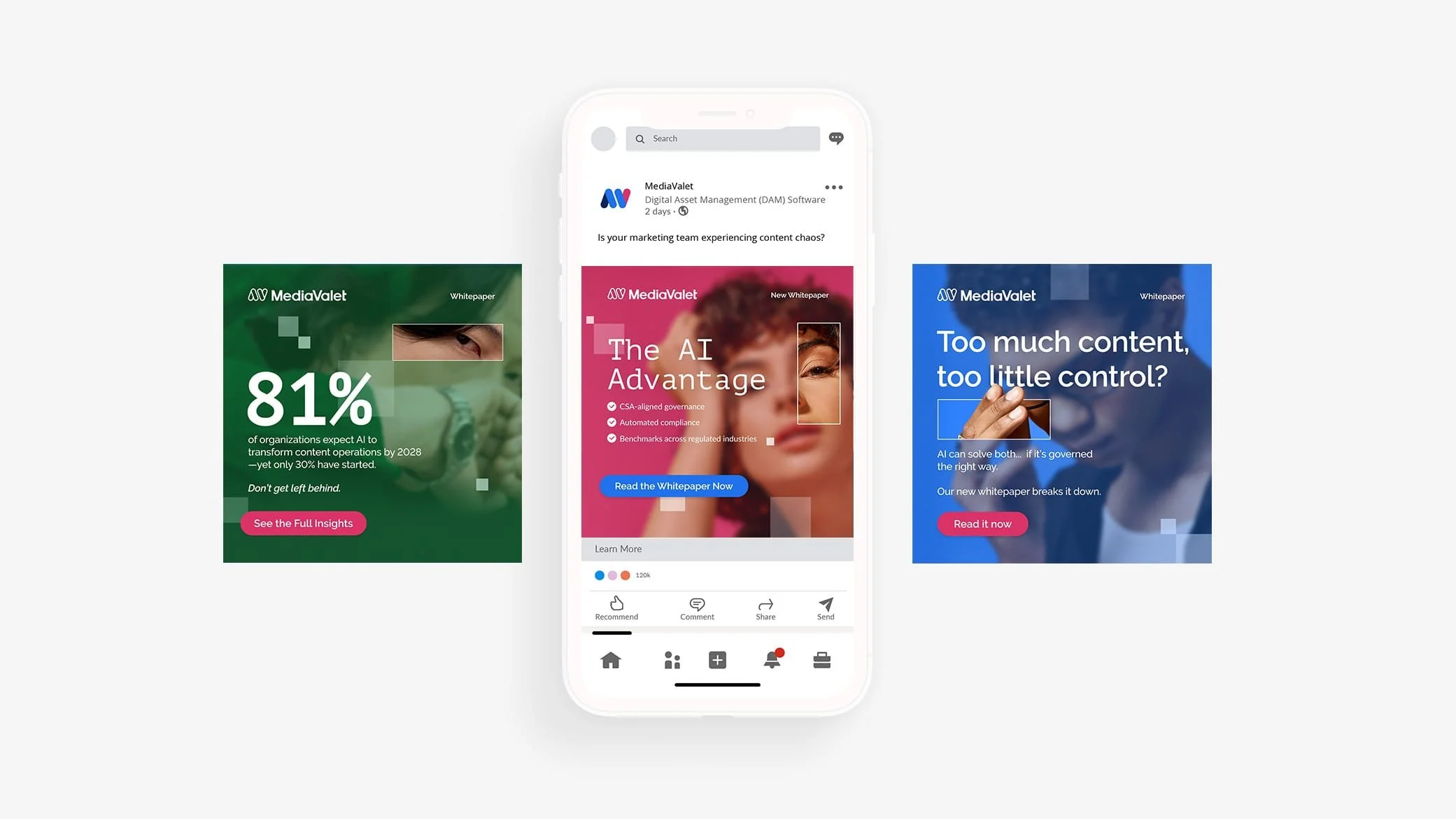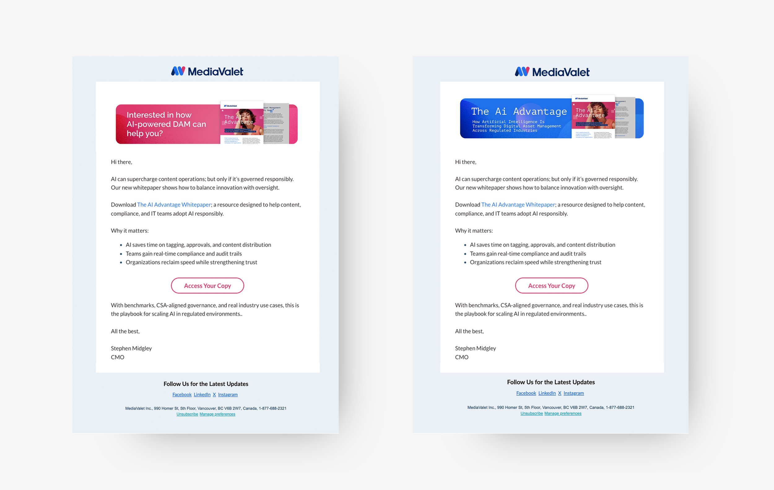 My creative director and I explored and brainstormed a variety of themes in Figma. I helped refined the art direction of the whitepaper capturing the MediaValet brand and AI topic. I edited images in Photoshop to match MediaValet’s colors and used Figma to stylize the images. I built the page on wordpress. Finally, I prepared all promotional images (email banners, digital ads, etc) and the landing page for launch.